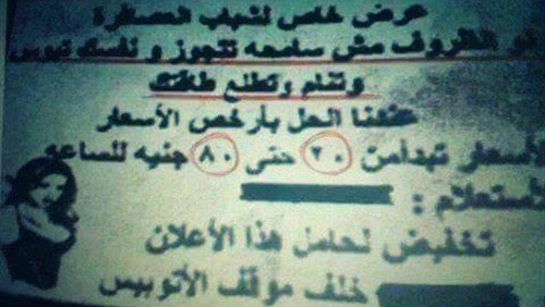 طبقة الشعب الكادحة التي تركب قطار «أبو قير» بالإسكندرية، الخط المحلي للمدينة، لاحظت كثرة إعلانات داخل القطار تدعو للدعارة وممارسة الفجور، وحدد الإعلان سعر الساعة من 20 جنيها إلى 80 جنيها، ويحمل الإعلان عنوان منزل بالعصافرة ورقم هاتف محمول.